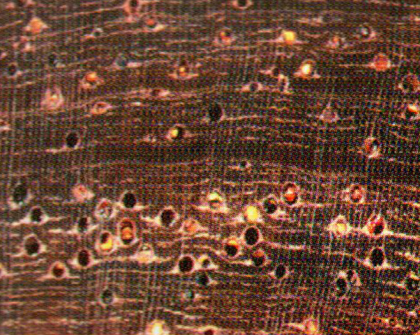 散孔材。管孔肉眼下略見(jiàn),甚少至略少,大小中等;主為單管孔。少數(shù)徑列復(fù)管孔(2-3個(gè));富含黑褐色樹(shù)膠,部分管孔內(nèi)可見(jiàn)金黃色的沉積物。類(lèi)似檀香紫檀的金星,軸向薄壁組織放大鏡下明顯,主為不規(guī)則斷續(xù)細(xì)線狀,還有部分翼狀和環(huán)管狀。木射線放大鏡下可見(jiàn),密至甚密,甚窄。波痕明顯。